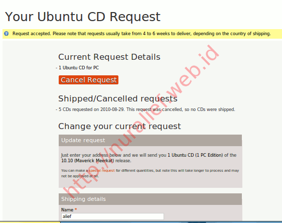Yang mau pesan CD ubuntu ini caranya gampang banget, dan tentu saja gratis, kecuali koneksi internet yang dipakai tentunya :)